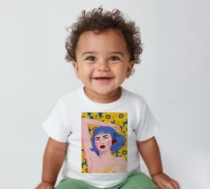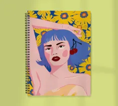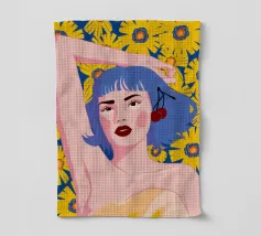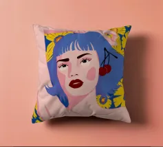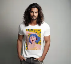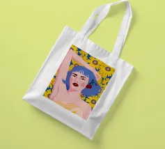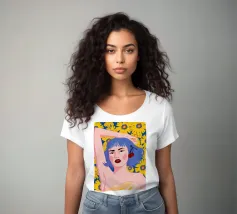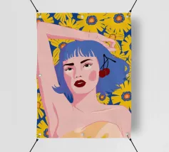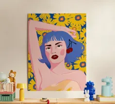 Un vibrante ritratto in stile pop art di una donna con eleganti capelli blu e un audace labbro rosso. La composizione su uno sfondo giallo sole con fiori è moderna, sicura e piena di energia.