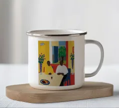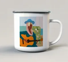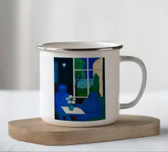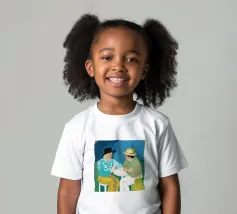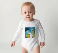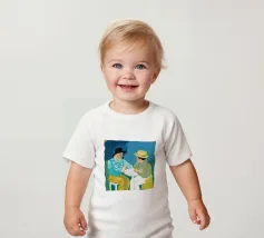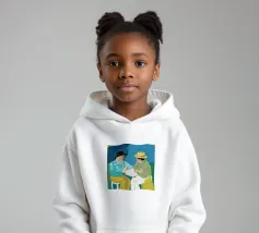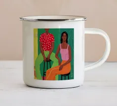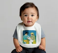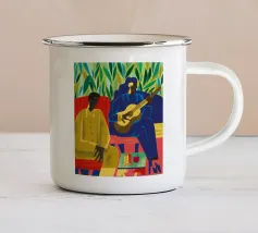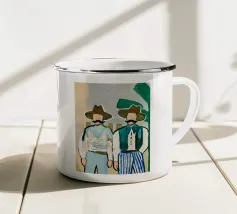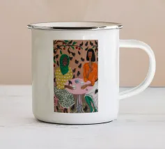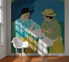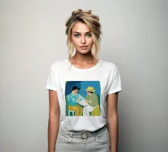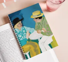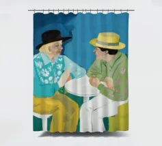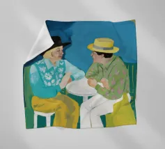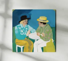 Illustrazione di due uomini eleganti, entrambi con il cappello, che prendono un caffè insieme in un bar all'aperto. Lo stile pittorico e la loro interazione rilassata creano una scena fresca e contemporanea di amicizia maschile.