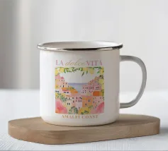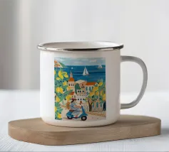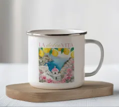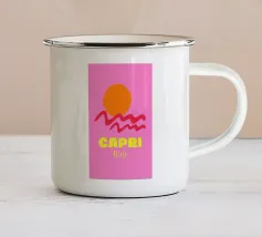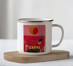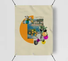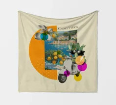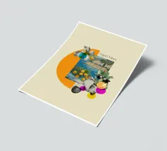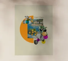 Celebrate la dolce vita con questa vivace stampa d'arte a collage ispirata a Capri, in Italia. Un incantevole dipinto di un villaggio di mare è incorniciato da allegri motivi di agrumi, uno scooter retrò e un cactus con gli occhiali da sole, il tutto stratificato con audaci forme astratte in arancione, magenta e verde acqua. È il pezzo perfetto per tutti coloro che desiderano le vibrazioni mediterranee, l'estetica retrò e l'eccentricità dell'arredamento ispirato ai viaggi.