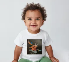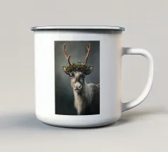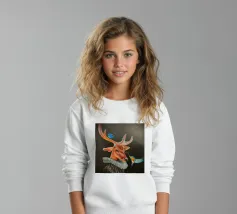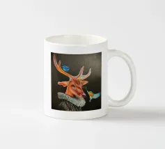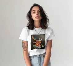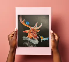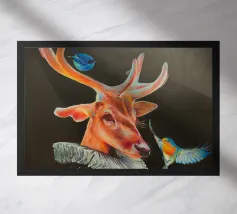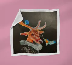 Questo dipinto presenta un nobile cervo, adornato da un elegante pagliericcio ispirato ai ritratti rinascimentali, accompagnato da piccoli uccelli dai colori vivaci. La sottile illuminazione e i contrasti evidenziano la profondità dello sguardo e la consistenza del manto, conferendo all'insieme un'aura di mistero.