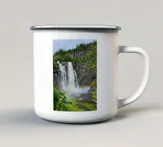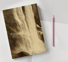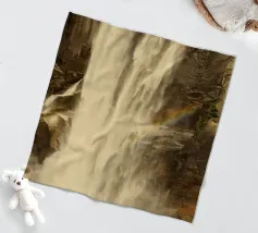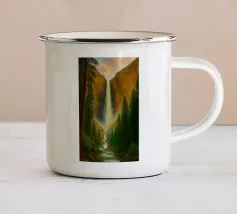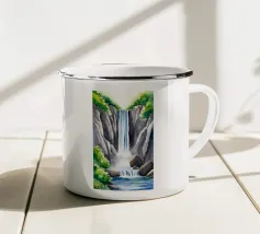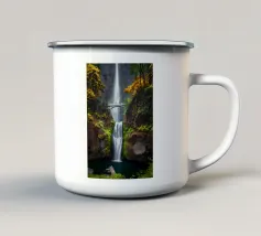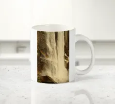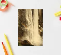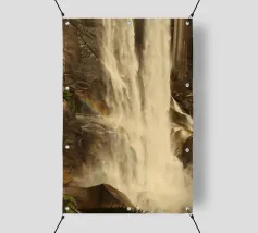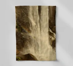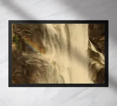 La nebbia sale alla sua base, riempiendo l'aria di freschezza, mentre il potente scroscio si fonde con i dolci suoni della natura, creando una scena maestosa e serena.