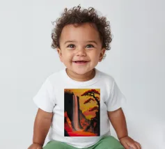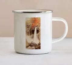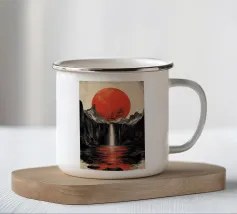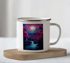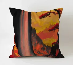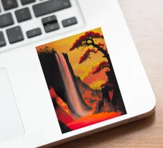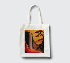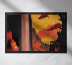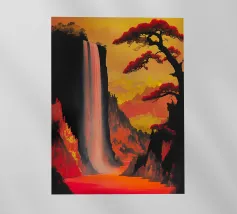 Un dipinto paesaggistico mozzafiato che raffigura una cascata in mezzo a un tramonto vibrante e infuocato. Un pino solitario si staglia sullo sfondo drammatico, con i suoi rami che si stagliano contro il cielo infuocato. La scena è ricca di colori contrastanti che creano un senso di stupore e meraviglia.