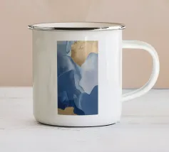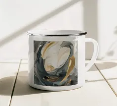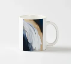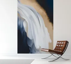 Un'opera astratta di grande impatto, caratterizzata da un flusso fluido e a cascata di bianco e blu tenue, contrastato da una fascia d'oro ricca e strutturata sul lato. La composizione emana un senso di tranquilla grandezza e di fluida eleganza.