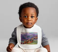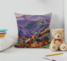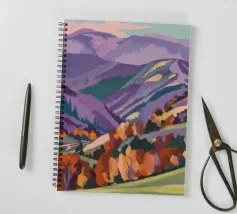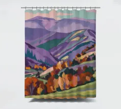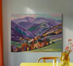 Un ampio paesaggio autunnale che raffigura una cascata di dolci colline vestite con i colori vibranti dell'autunno - arancioni, gialli e verdi - che si allontanano gradualmente verso le lontane e vaporose montagne viola sotto un cielo morbido e atmosferico.