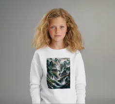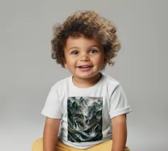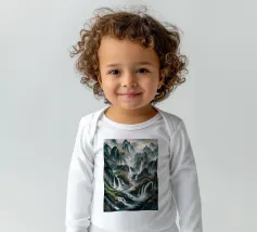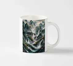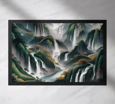 Questo dipinto paesaggistico mozzafiato cattura la serena bellezza delle cascate in mezzo a montagne verdeggianti, ornate da scintillanti accenti dorati.