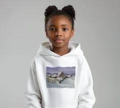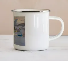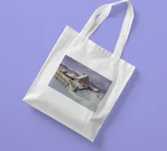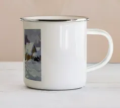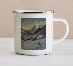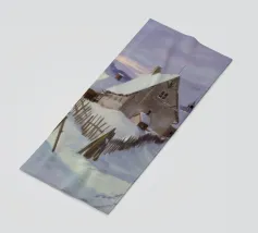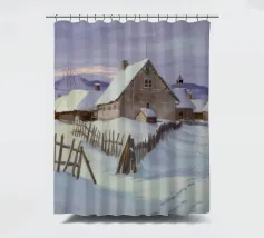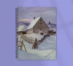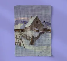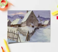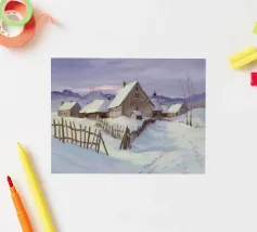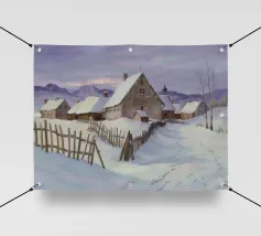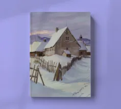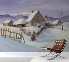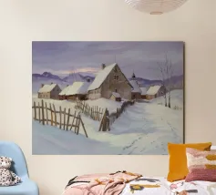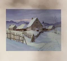 Un dipinto raffigura una casa colonica tradizionale e gli annessi coperti di neve, con una staccionata di legno in primo piano, che trasmette un senso di tranquilla vita rurale in inverno sotto un cielo grigio e soffice.