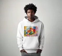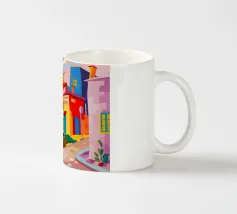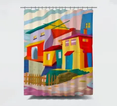 Una vibrante rappresentazione astratta di case colorate sul pendio di una collina, che utilizza forme geometriche e una tavolozza audace, che ricorda l'arte cubista, trasmettendo una comunità dinamica e vivace.