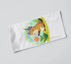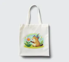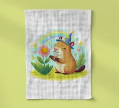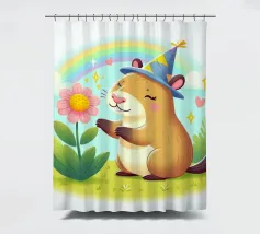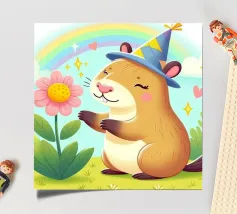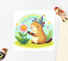Questa deliziosa illustrazione raffigura un allegro castoro che indossa un cappello blu da festa ornato da motivi gialli e blu. Il castoro si allunga per toccare un vivace fiore rosa con il centro giallo, circondato da foglie verdi. Lo sfondo è una scena stravagante con un arcobaleno, stelle scintillanti, cuori e soffici nuvole, che creano un'atmosfera gioiosa e magica.