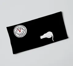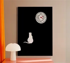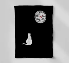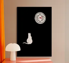 Un gatto guarda un orologio che mostra con umorismo la parola "EAT" al posto dei numeri. Il design minimalista sottolinea la singolare attenzione del felino per il momento del pasto.