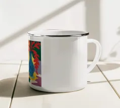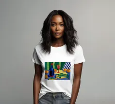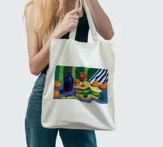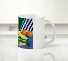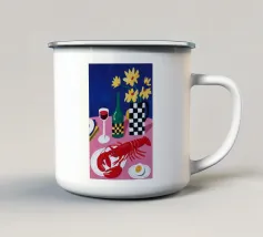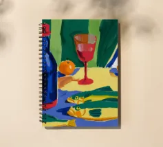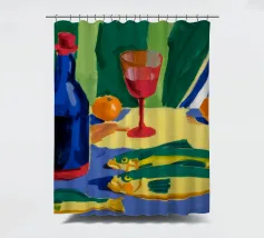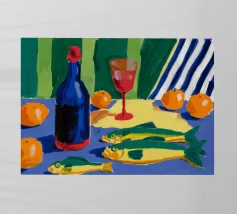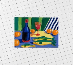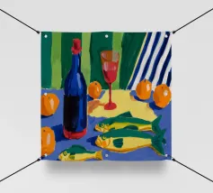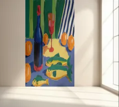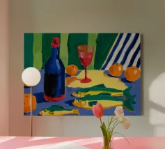 Una scenografica natura morta con due pesci su un piatto, un bicchiere di vino rosso e arance, su uno sfondo a strisce bianche e blu. La composizione è moderna, grafica e leggermente misteriosa, perfetta per uno spazio da pranzo contemporaneo.