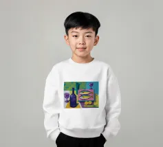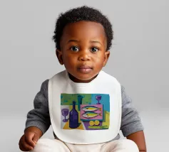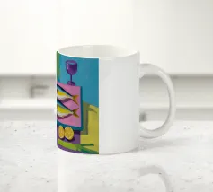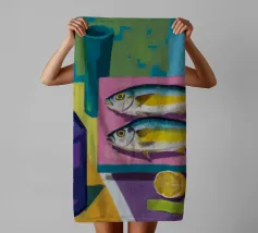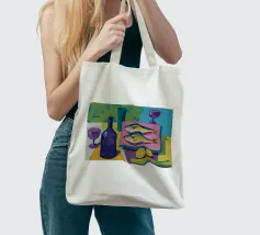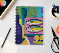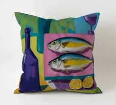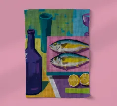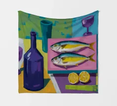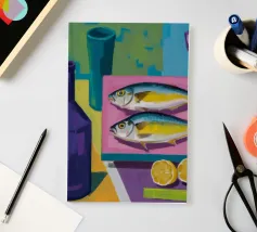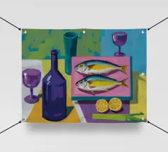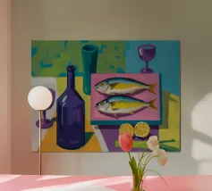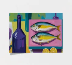 Una semplice ed elegante natura morta di due pesci su un piatto accanto a un bicchiere di vino rosso e a una bottiglia blu. La composizione su uno sfondo blu e verde tenue è minimalista e serena, con un'attenzione particolare a forme e colori puliti.
