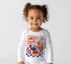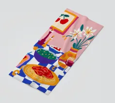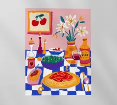 Una deliziosa natura morta di un piatto di spaghetti con ciliegie, una bottiglia di vino e un vaso di fiori. La composizione è una rappresentazione ricca, appetitosa e affascinante di un pasto perfetto e semplice.