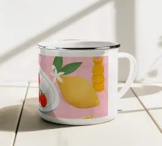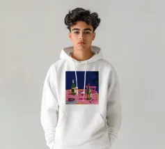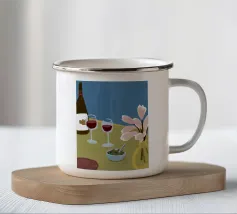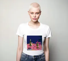 Una natura morta intima di una cena per due con una bottiglia di vino, bicchieri e olive su una tovaglia rosa, su uno sfondo scuro che ricorda un vigneto al tramonto.