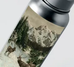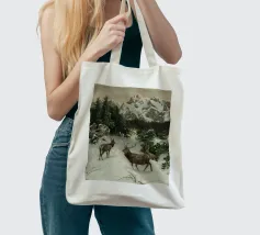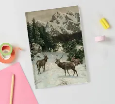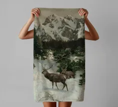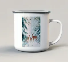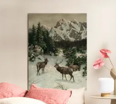 Un suggestivo motivo invernale: tre cervi si ergono maestosi in un paesaggio montano innevato, con abeti e cime sullo sfondo. I colori naturali e l'atmosfera tranquilla rendono questo disegno perfetto per gli amanti della natura e degli animali. Che si tratti di un murale, di un cuscino, di una tazza o di un poster, questo motivo porta il romanticismo invernale della fauna selvatica, l'eleganza e la tranquillità in ogni casa.