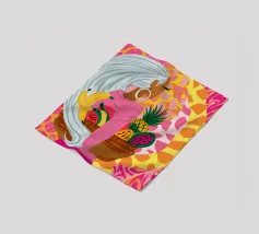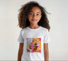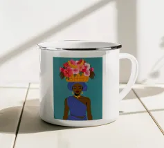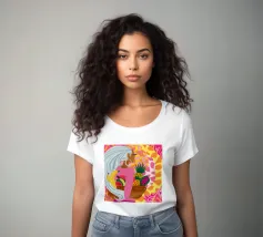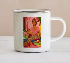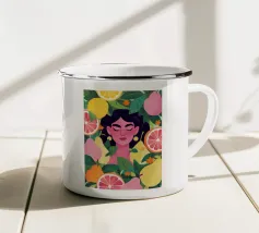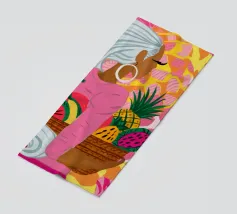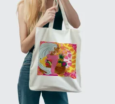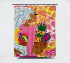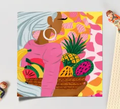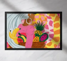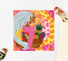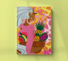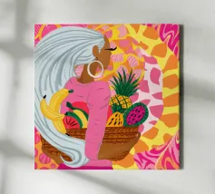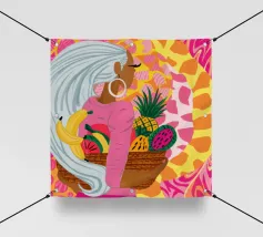 Ritratto di una bella donna dai lunghi capelli bianchi che tiene in mano un cesto di frutta tropicale, tra cui un ananas. La composizione è una vibrante, potente e rigogliosa celebrazione dell'abbondanza naturale e della bellezza femminile.