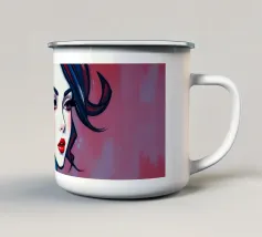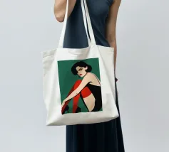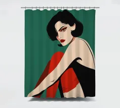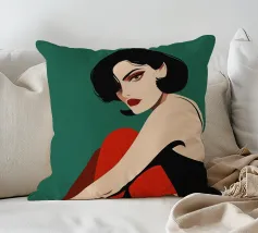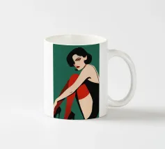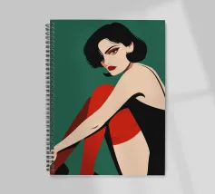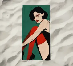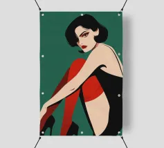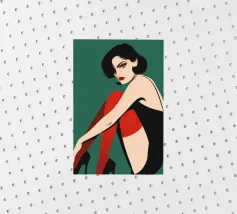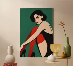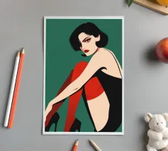 Un'elegante illustrazione di pin-up mostra una donna affascinante con bretelle rosse e tacchi alti, seduta in una posa seducente. I capelli neri e le labbra rosse conferiscono all'immagine un tocco di eleganza e sensualità vintage.