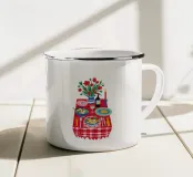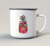 Un'affascinante natura morta raffigura un delizioso picnic su un telo di percalle rosso e bianco, con fiori in bottiglia, pane e marmellata, evocando un senso di dolce e rustica nostalgia.