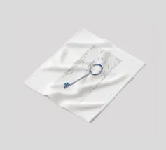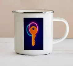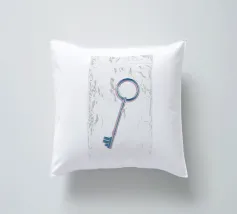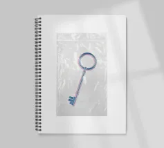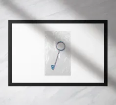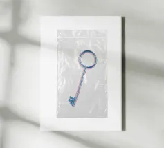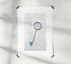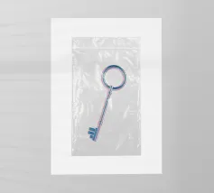 Chiave dal design cromato iridescente in un sacchetto di plastica testurizzato