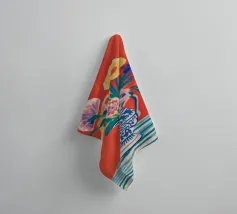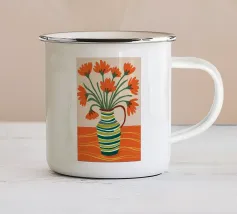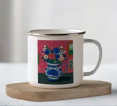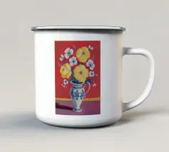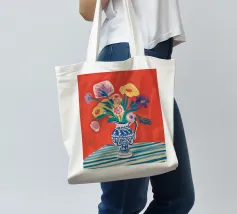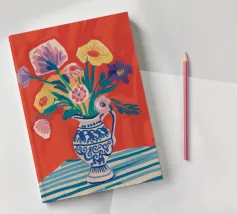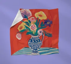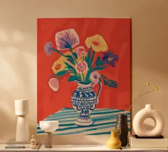 Un vivace bouquet di fiori nei toni del rosso, del giallo e del blu è disposto in un classico vaso a cineserie blu e bianco. L'ambientazione comprende una tovaglia a righe e uno sfondo luminoso e caldo.