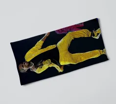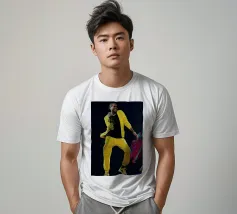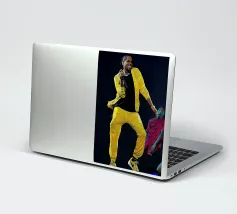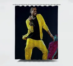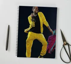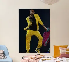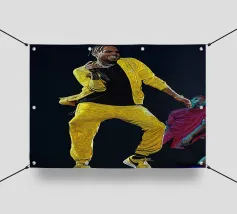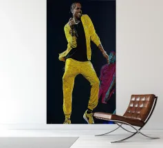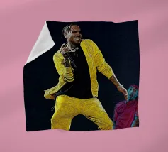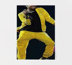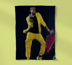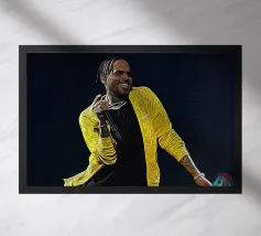 Un vibrante lampo di ritmo e anima, questo acquerello retrò cattura Chris Brown nel bel mezzo di un'esibizione, un'esplosione di energia avvolta in toni dorati.