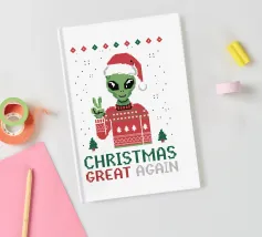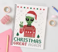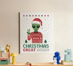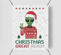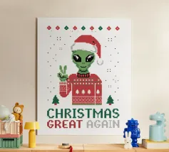 Un alieno con cappello da Babbo Natale e maglione festivo fa un segno di pace circondato da fiocchi di neve e decorazioni natalizie. Sotto, le parole "CHRISTMAS GREAT AGAIN" sono scritte in un testo colorato e pixelato.