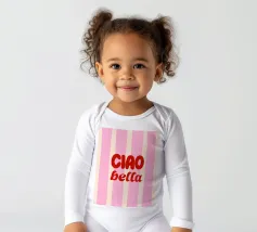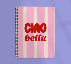 Le eleganti strisce rosa e crema con l'audace frase rossa "Ciao Bella" in tipografia retrò aggiungono un tocco romantico ed elegante a qualsiasi arredamento.