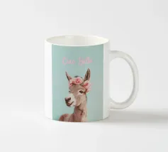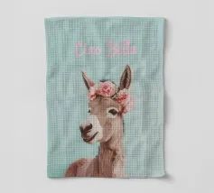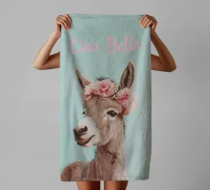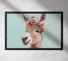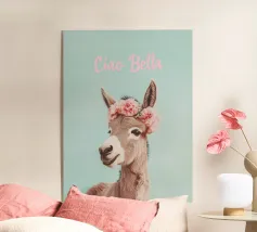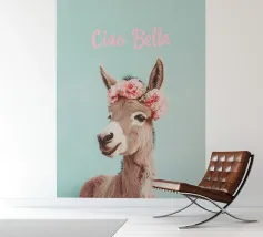 Un simpatico asino con una corona di fiori rosa e lo slogan "Ciao Bella" conferisce un tocco estivo italiano a questo affascinante ritratto.
