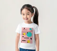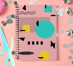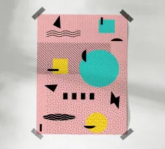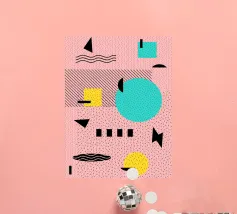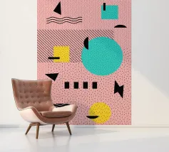 Divertente disegno geometrico di Memphis in stile retrò anni '80 con forme geometriche, cerchi, quadrati, triangoli, onde e linee in verde acqua, giallo e nero, su uno sfondo color pesca pastello.