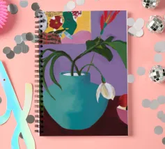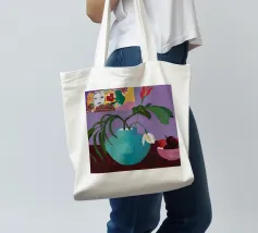 Un vaso sferico azzurro mette in mostra grandi foglie verdi e alcuni delicati fiori rosa, con una piccola ciotola di ciliegie rosse brillanti nelle vicinanze, su uno sfondo viola intenso.