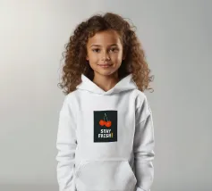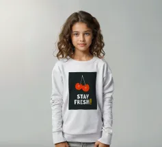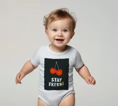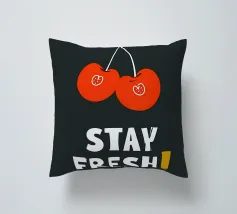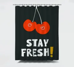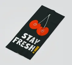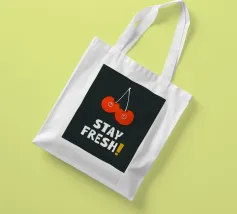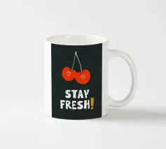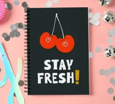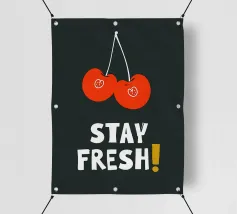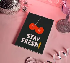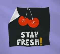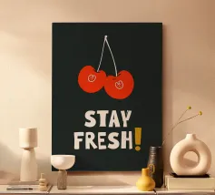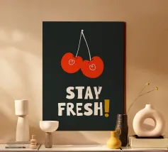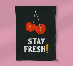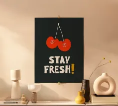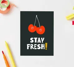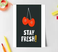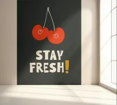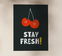 Un'illustrazione vivace con due ciliegie rosse brillanti appese ai loro steli su uno sfondo scuro. Lo stile giocoso e disegnato a mano e il messaggio in grassetto "STAY FRESH!", punteggiato da un punto esclamativo giallo, creano un'atmosfera divertente ed energica.