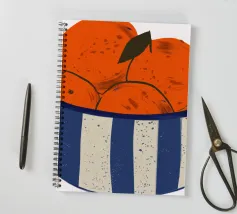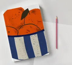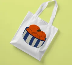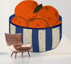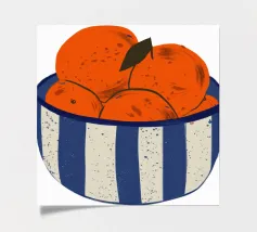 Una semplice natura morta di una ciotola a righe bianche e blu riempita di arance brillanti. La composizione è pulita, moderna e ha un'atmosfera fresca e mediterranea.