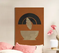 Questo design artistico combina forme geometriche e colori della terra, creando un'armoniosa interazione tra modernità e fascino retrò. La base calda e color ruggine e le linee minimaliste conferiscono al motivo un'estetica senza tempo. Come murale, su cuscini, tazze o cover per cellulari, questo motivo è ideale per creare accenti di stile nella vostra casa. Perfetto per gli amanti del design creativo e moderno