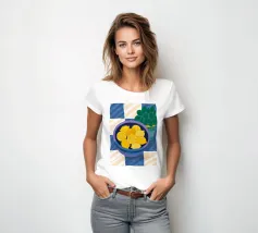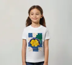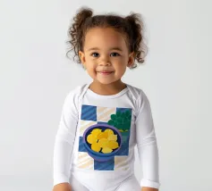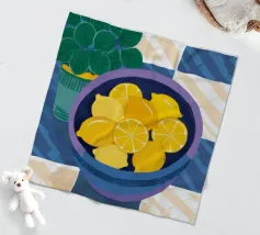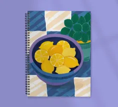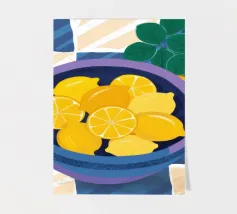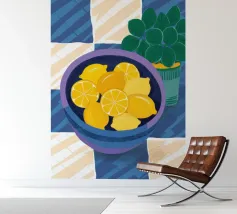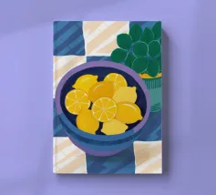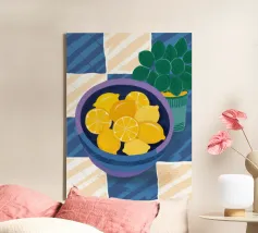 Natura morta di una ciotola di limoni su uno sfondo a scacchi blu e bianchi, con una pianta verde nelle vicinanze. La composizione è fresca, grafica e moderna.