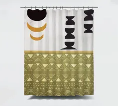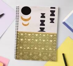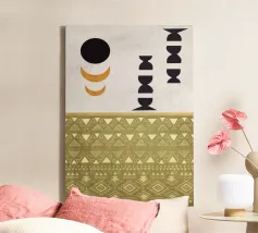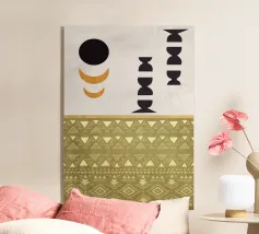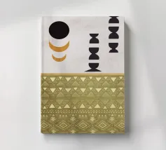 Forme geometriche, tra cui cerchi e mezzelune, sono disposte in uno stile minimalista su uno sfondo strutturato. Una sezione a motivi presenta file di triangoli e rombi nei toni della terra.