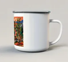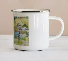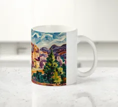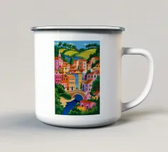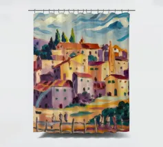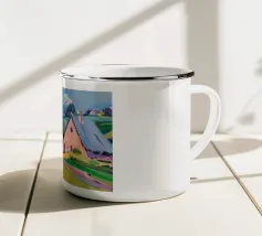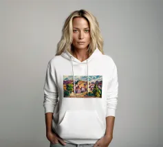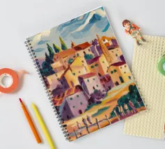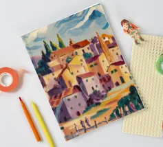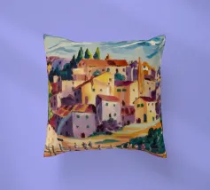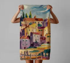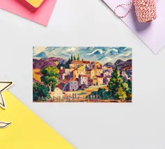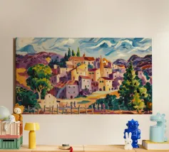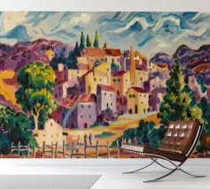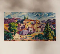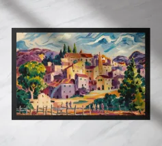 Una pittoresca cittadina con case bianche e dai tetti in terracotta si estende su una collina assolata, circondata da alberi e vegetazione verde sotto un cielo azzurro e limpido. Lo stile impressionistico cattura l'atmosfera luminosa e calda di un villaggio mediterraneo o europeo.