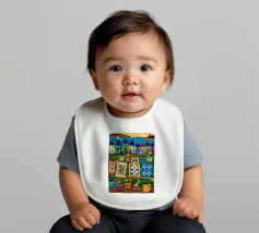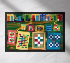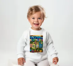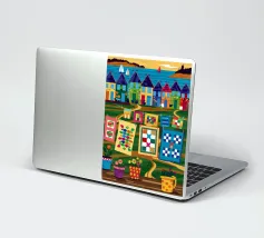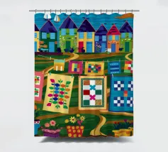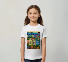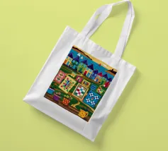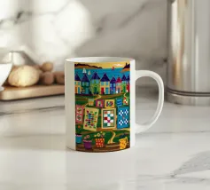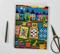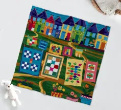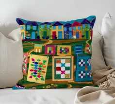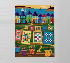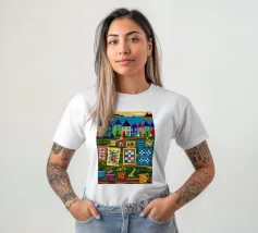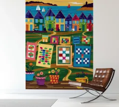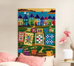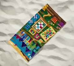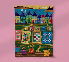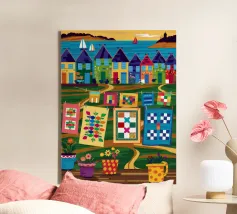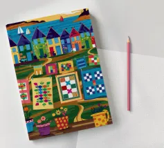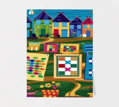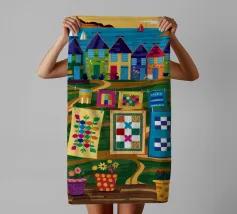 Illustrazione di una colorata città di mare, resa in uno stile che ricorda una trapunta patchwork. Le forme stravaganti e i colori vivaci creano un paesaggio affascinante, popolare e fantasioso.