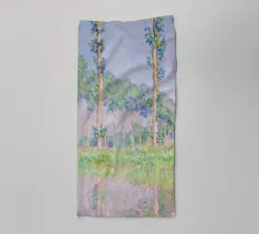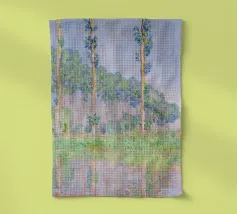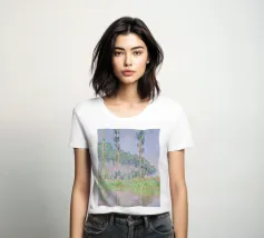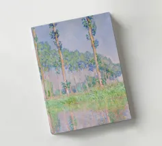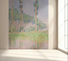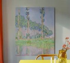 Parte della celebre serie dei Pioppi, quest'opera impressionista cattura una fila di esili pioppi lungo il fiume Epte, immersi nel tenue bagliore rosato del crepuscolo. Le pennellate sciolte ed espressive di Monet creano un senso di movimento quando gli alberi ondeggiano dolcemente nella brezza, mentre i riflessi scintillanti nell'acqua aumentano la qualità onirica della scena. Claude Monet Pioppi effetto rosa