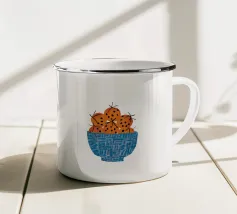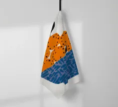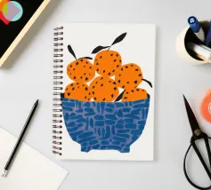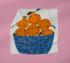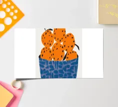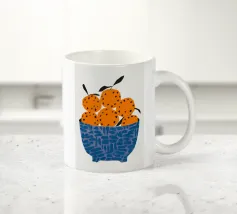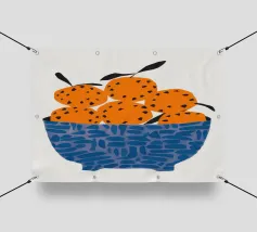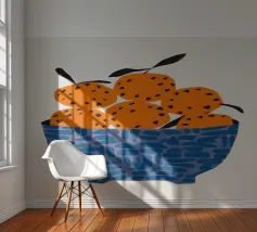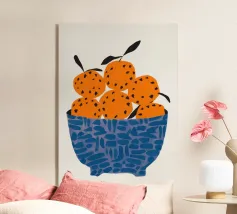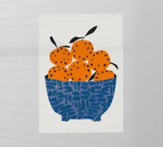 Un'illustrazione grafica e strutturata di una ciotola blu a fantasia che trabocca di arance brillanti. La semplicità della composizione si concentra sul colore vibrante e sulla consistenza della frutta, rendendola un pezzo fresco e moderno.