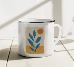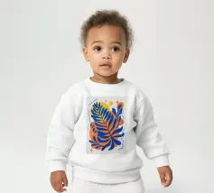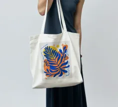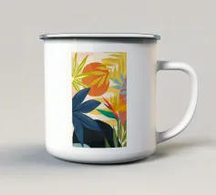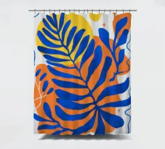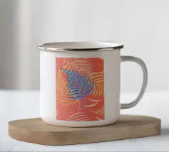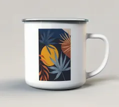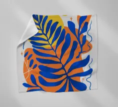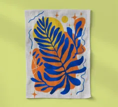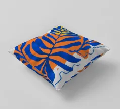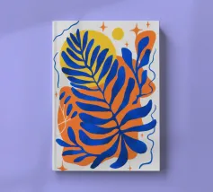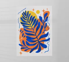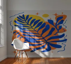 Un'illustrazione astratta audace e grafica di foglie stilizzate in arancione e blu vibranti. La composizione dinamica e i colori ad alto contrasto creano una danza energica di forme naturali.