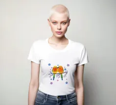Due conuri del sole, pappagalli dai colori vivaci. I due uccelli si stanno coccolando. Sono circondati da fiori rosa e viola e appollaiati su un ramo.