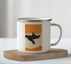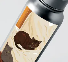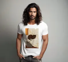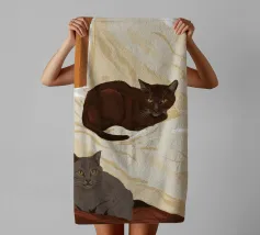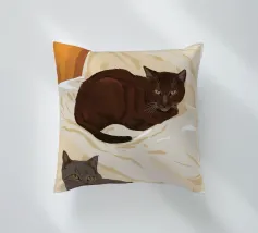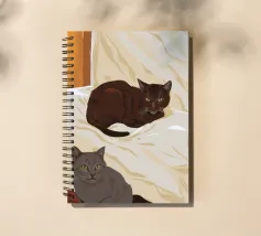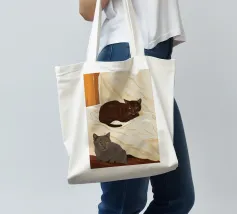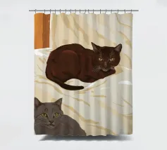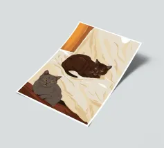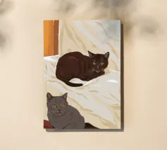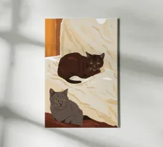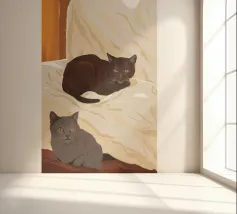 Due adorabili gatti, uno nero e uno soriano grigio, riposano insieme su un comodo letto con lenzuola bianche illuminate dal sole. L'opera d'arte cattura un momento caldo, intimo e accogliente tra due compagni animali.