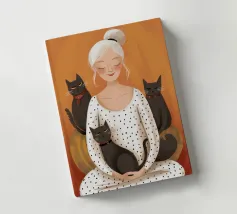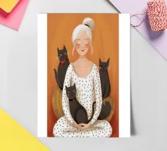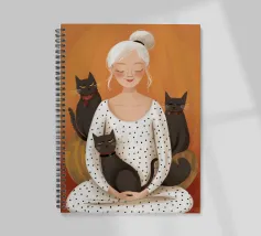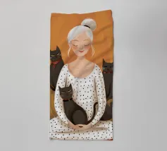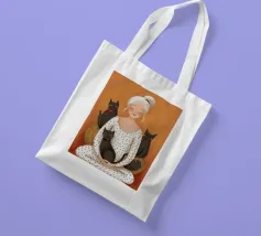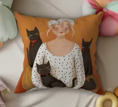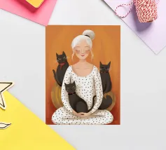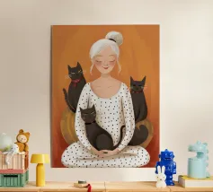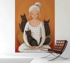Una donna dall'espressione serena e dai capelli bianchi coccola amorevolmente due gatti neri, trasmettendo un profondo senso di pace, compagnia e affetto.