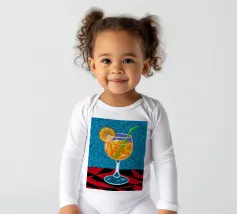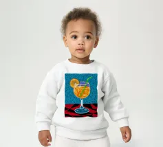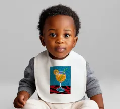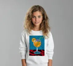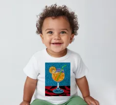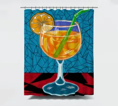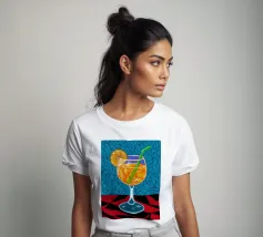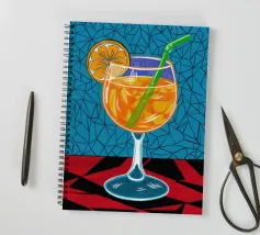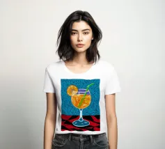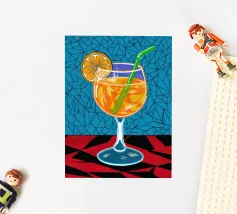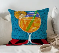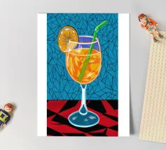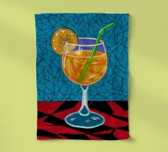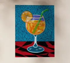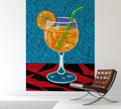 Un'illustrazione grafica e vivace di un cocktail con una fetta d'arancia in un bicchiere stilizzato. Lo sfondo presenta un mix di motivi blu e rossi, creando un'atmosfera moderna ed energica.