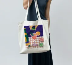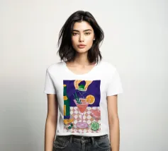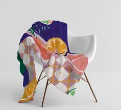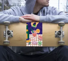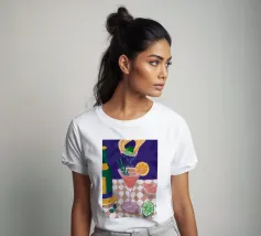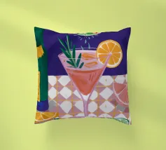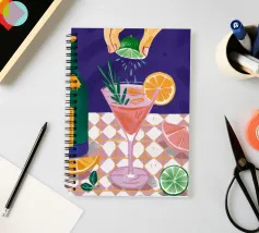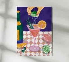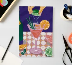 Una vivace illustrazione ravvicinata di due cocktail, uno al lime e uno all'arancia, su uno sfondo a fantasia. L'opera è una rappresentazione fresca e divertente di un happy hour tropicale.