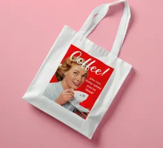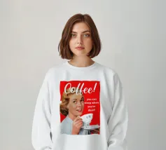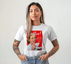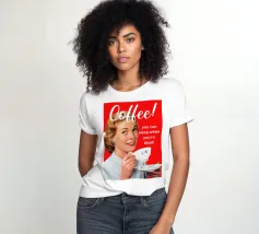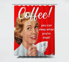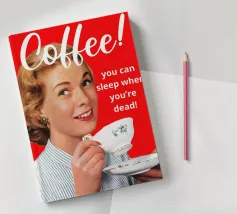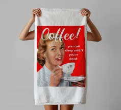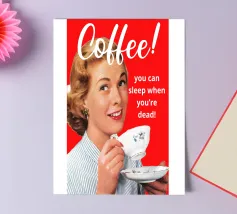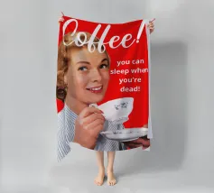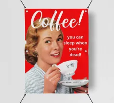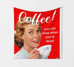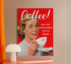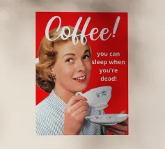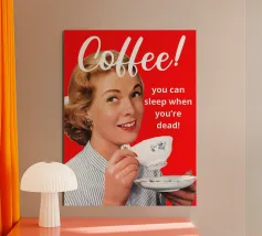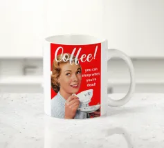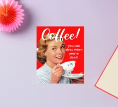 Una donna sorridente tiene in mano una tazza da tè con il testo in grande "Caffè! Puoi dormire quando sei morto!". L'immagine ha un tono vintage e umoristico.