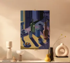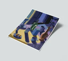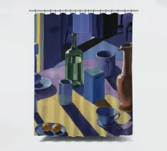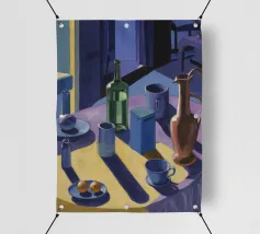 Una lunatica scena mattutina di tazze, bottiglie e piatti immersi in drammatiche ombre viola attraverso la luce della finestra.
