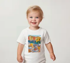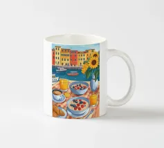 Un tavolo per la colazione con frutti di bosco, croissant, succo d'arancia e caffè è ornato da un vaso di girasoli. Sullo sfondo, edifici colorati in riva al mare e barche sulla riva completano la vista panoramica.