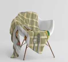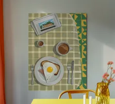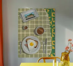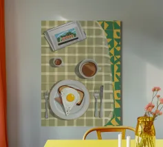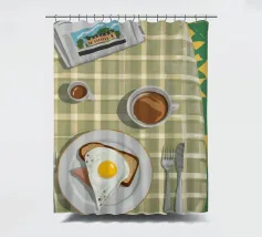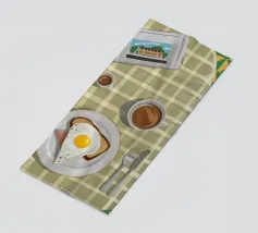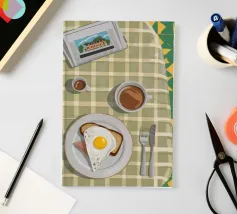Una classica colazione a base di uova fritte su pane tostato con una tazza di caffè è vista dall'alto, su una tovaglia a scacchi, creando una natura morta mattutina semplice, accattivante e senza tempo.
