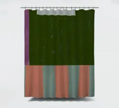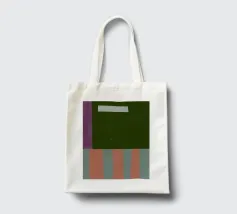 Viene presentata una composizione semplicistica ma audace, caratterizzata da ampie aree di colore piatto. Una striscia verticale viola si affianca a un consistente campo verde scuro che domina la maggior parte dello spazio, mentre la parte inferiore presenta strisce alternate di corallo e blu chiaro. Un'unica barra orizzontale bianca galleggia sullo sfondo verde, creando un contrasto visivo di grande effetto.