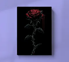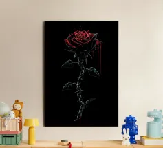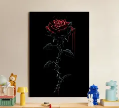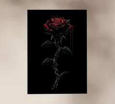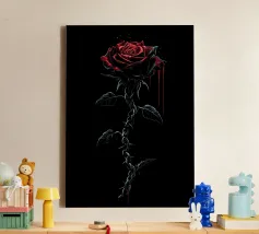 Una rosa dal design intenso, il cui gambo si trasforma in una catena di spine scura e metallica - drammatica, ricca di contrasti e piena di simbolismo. I dettagli rosso sangue rafforzano l'impressione di passione e dolore. Quest'opera d'arte si rivolge agli amanti del romanticismo dark, dell'estetica del tatuaggio o del simbolismo potente. Ideale per ambienti moderni, camere da letto o come elemento espressivo in contesti emotivi.